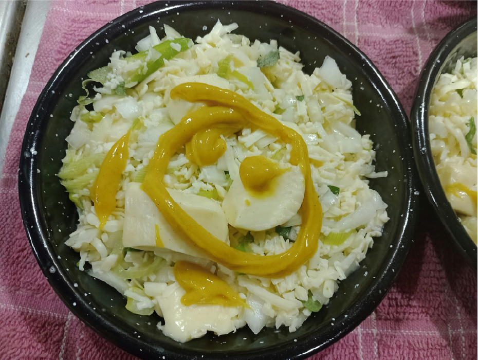 - 감자즙의 윗물을 따라내고 가라앉은 전분을 감자 건더기에 섞는다.
