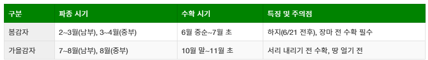 • 봄감자: 3~4월 파종 → 6월 중순~7월 초 수확(하지 전후, 장마 전)