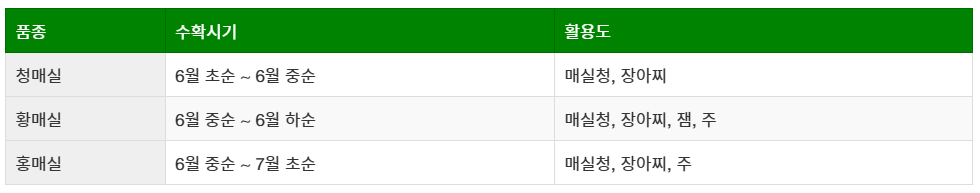 - 청매실: 푸른빛이 강하고 단단할 때(종자가 막 굳어질 때) 수확하며, 매실청에 적합합니다.