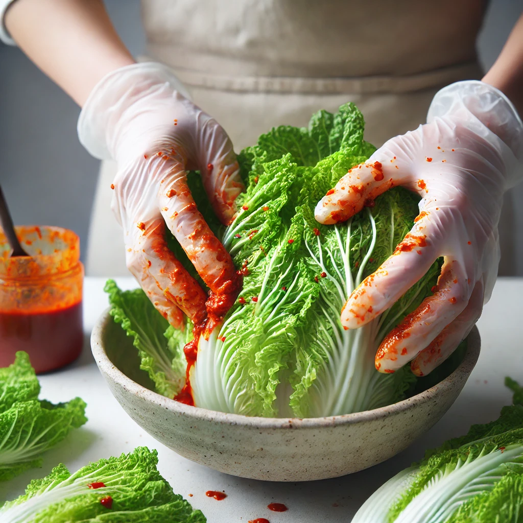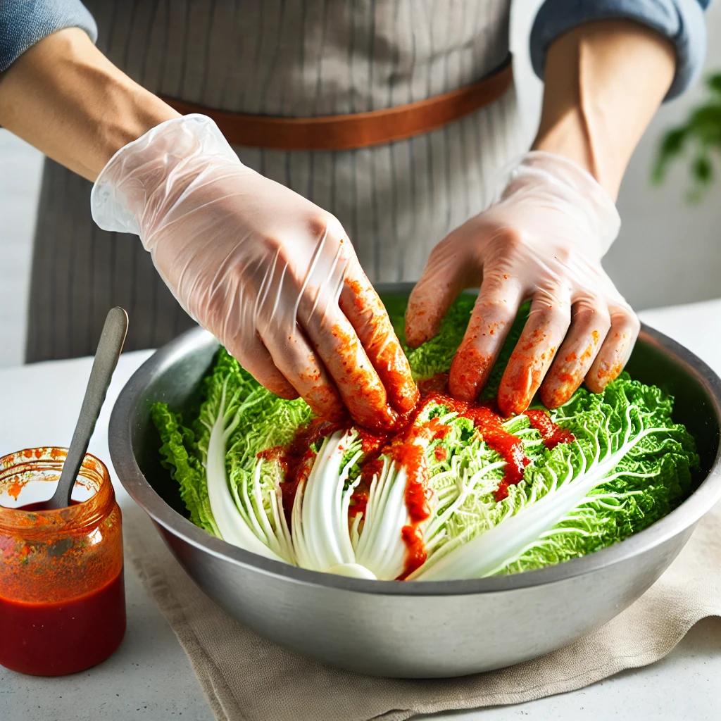- 고추 양념이 손에 스며들지 않도록 비닐 장갑 착용